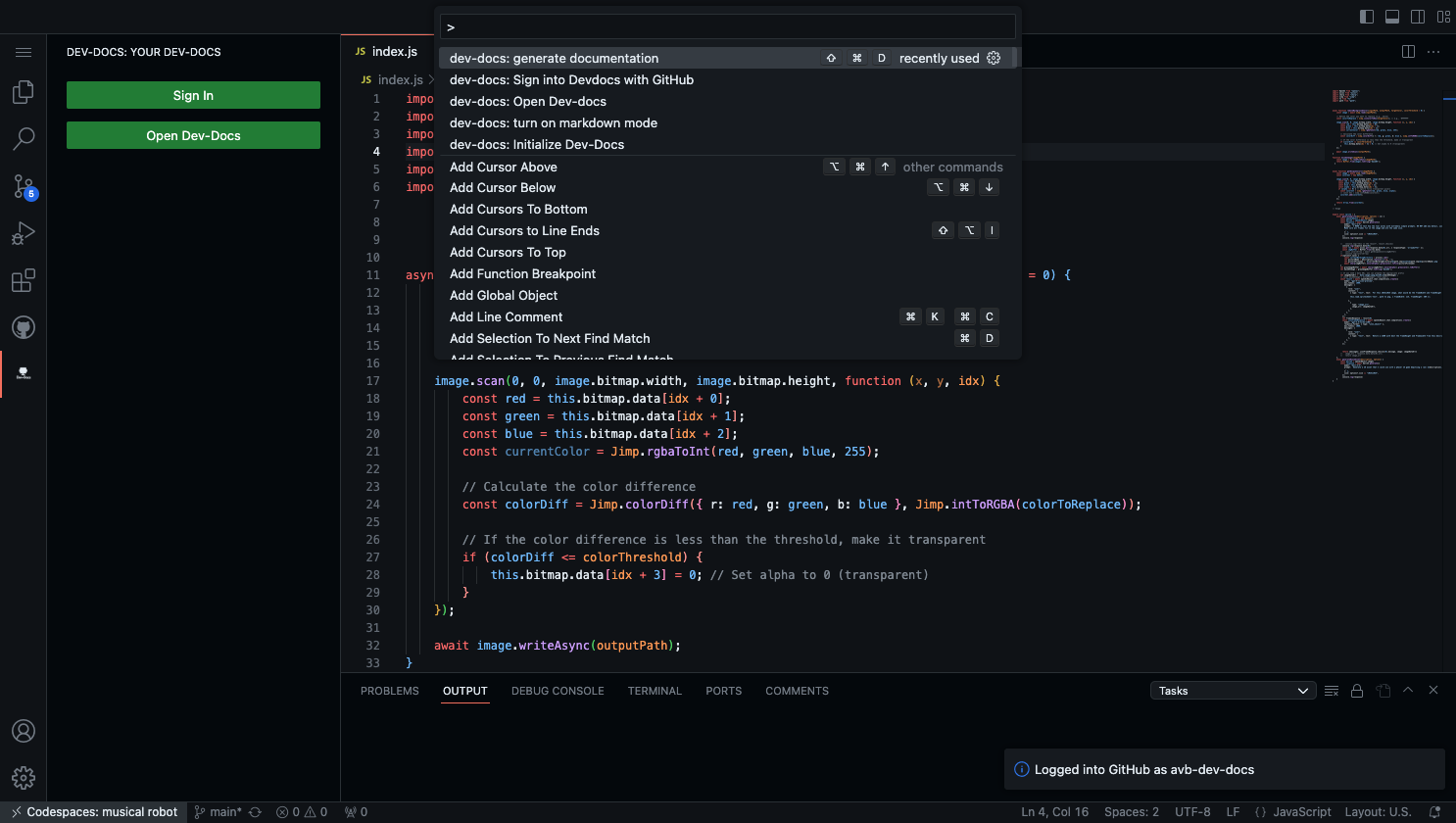 Select the file you wish to be documented. From there, open the command palette, search and select dev-docs: generate documentation or run shift command d.